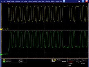 在系統檢測到多個跳變時,MSO5000B 系列多跳變檢測硬件會在顯示屏上顯示一個白邊。 白邊表示放大或以更快的采樣率采集可以獲得更多的信息。 在大多數情況下,放大操作可以揭示以前的設置看不到的脈沖。