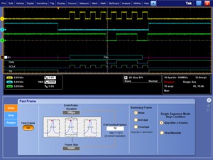 為提高數據捕獲效率,分隔存儲可以擴展捕獲的總時間。 FastFrame™ 分段存儲器模式可讓您通過每秒高達 310,000 個觸發的捕獲速度,選擇高達 290,000 個存儲段。 除存儲靈活性外,各個段均已打上時間標記,可以單獨查看多個段,或使用協議解碼等高級功能以重疊方式查看和分析多個段。