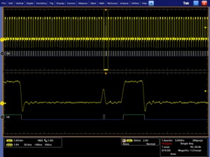 如果想調試設計問題,首先必須知道存在問題。 每個設計工程師都要用大量的時間查找電路中的問題,如果沒有合適的調試工具,這項任務耗時長、非常麻煩。 MSO/DPO5000B 系列提供業內最完整的捕獲和隔離事件功能,可以快速地深入地分析設備真實的工作狀況。 泰克專有的 FastAcq™ 技術提供了快速波形捕獲功能,每秒可以捕獲超過 250,000 個波形,您可以在幾秒鐘內看到毛刺和其它偶發瞬態信號,揭示被測設備出現問題的真正原因。 帶有顏色輝度等級的數字熒光顯示器通過在信號區域的不同輝度,來顯示信號活動的歷史信息,從而以可視方式顯示異常事件的發生頻次。