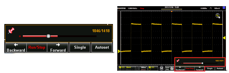 GDS-300/GDS-200系列示波器內建30,000筆波形記錄以及回放功能。工程師能夠使用此功能進行長時間的電路監控,當30,000筆波形量測完成時,還能重復播放過去的記錄,當電路中若發生間歇性的異常波時,便可利用回放功能找到問題發生之所在,提供使用者一個強大的搜尋以及除錯利器。