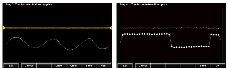 許多的元件或系統制造業者在做質量管制或是出貨生產時,需要良品與不良品的報告分析。GDS-300/GDS-200系列示波器依然保有固緯示波器原有GO/NOGO的功能,可以根據量測的波形,建立相對應的波形模板,以進行通過與非通過的結果計算。除此之外,此示波器亦可進行模板自我編輯的功能,使用者可以根據測試或環境條件來任意編輯模板之型態,亦可訂立不同之上下界模板,使得GO/NOGO的功能更加多元化以及人性化。