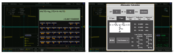 GDS-300/GDS-200系列示波器內建多樣化的應用軟件以提供使用者極為貼心的輔助工具。在繁瑣的電路設計當中,工程計算機軟件可提供簡易到進階的數學計算功能,讓工程師能夠徹底地了解電路的響應以及參數表現值。衰減器計算軟件不僅提供衰減值計算的功能,亦提供在不同的衰減模型下,該具備的各項元件參數數值。電阻值計算軟件,可以根據不同的表面鑲嵌式電阻代碼提供正確的阻值外,亦提供色碼電阻阻值的查詢功能,對于初學的學生到資深的電子工程師皆是一向強大的輔助利器。