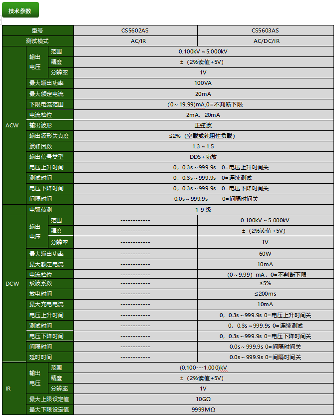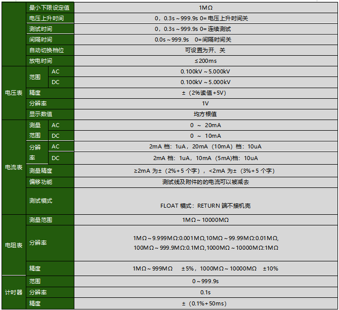 自動絕緣/耐壓測試儀,耐壓電壓0.10~5.00kV(AC)、漏電流范圍0.100~20.00mA(AC),絕緣電阻測試電壓100V/250V/500V/1000V、電阻范圍1~9999MΩ,耐壓測量精度±(2%+2個字),絕緣電阻測量精度±(5%+2個字)。