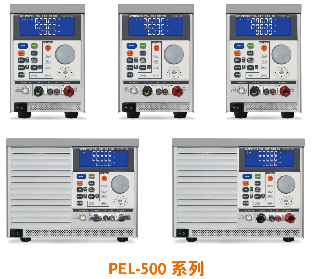 PEL-500 系列單通道電子負載,共有5個型號分別提供0~80V/0~500V電壓操作范圍及250~700W的功率操作范圍。可以應用于研發、品管、ATE系統及生產測試,包括電壓源/電流源測試、開關電源瞬時響應、定電壓模式供限流測試及模擬電池、電池放電測試、電池充電測試。